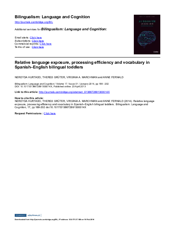 Pdf Relative Language Exposure Processing Efficiency And Vocabulary In Spanish English Bilingual Toddlers Nereyda Hurtado Theres Gruter And Virginia A Marchman Academia Edu