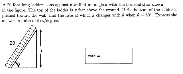 A Ladder 20 Ft Long Leans Against A Vertical Wall The Top End Slides Downwards At The Rate Of 2 Ft Per Second The Rate At Which The Lower End Moves On